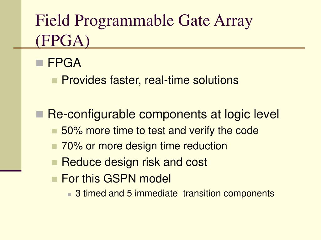 Field Programmable Gate Array (FPGA) • FPGA • Provides faster, real-time solutions • Re-configurable components at logic level • 50% more time to test and verify the code • 70% or more design time reduction • Reduce design risk and cost • For this GSPN model • 3 timed and 5 immediate transition components