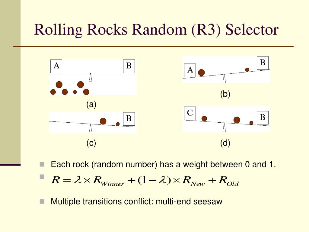 Rolling Rocks Random (R3) Selector (b) (a) (c) (d) • Each rock (random number) has a weight between 0 and 1. • Multiple transitions conflict: multi-end seesaw