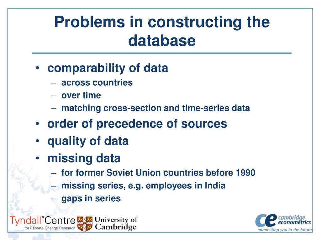 Problems in constructing the database • comparability of data • across countries • over time • matching cross-section and time-series data • order of precedence of sources • quality of data • missing data • for former Soviet Union countries before 1990 • missing series, e.g. employees in India • gaps in series