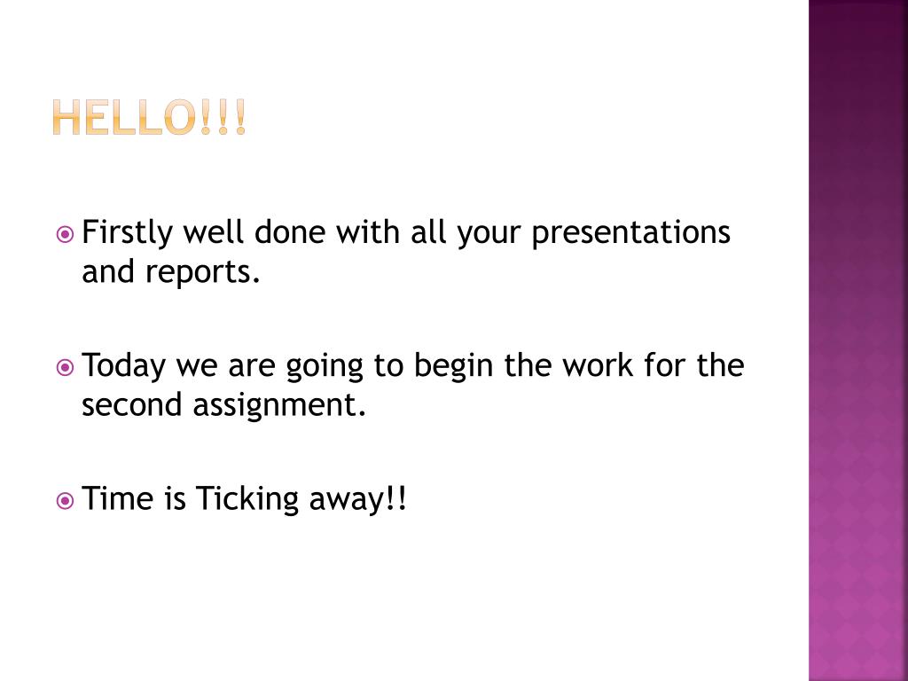 Hello!!! • Firstly well done with all your presentations and reports. • Today we are going to begin the work for the second assignment. • Time is Ticking away!!