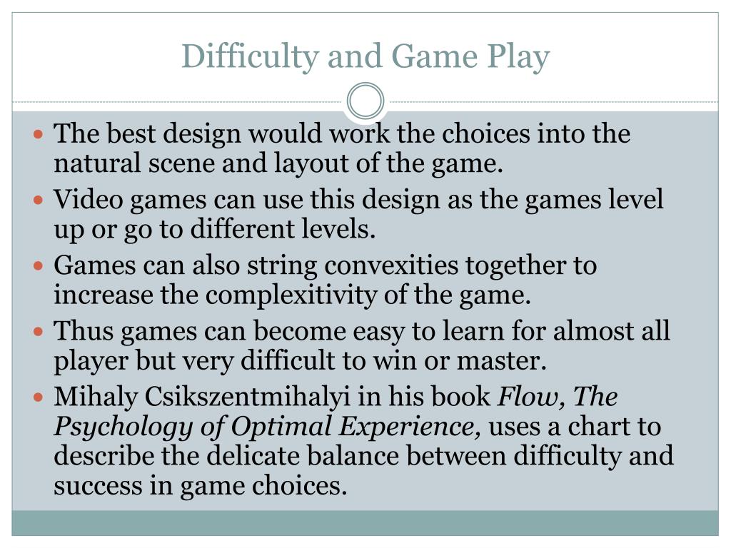 Difficulty and Game Play The best design would work the choices into the natural scene and layout of the game. Video games can use this design as the games level up or go to different levels. Games can also string convexities together to increase the complexitivity of the game. Thus games can become easy to learn for almost all player but very difficult to win or master. MihalyCsikszentmihalyi in his book Flow, The Psychology of Optimal Experience, uses a chart to describe the delicate balance between difficulty and success in game choices.