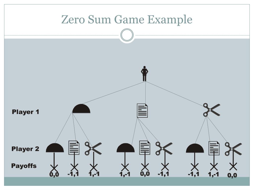 Zero sum games • Use competitive behavior between players resulting in only one winner. • Each player has a different interest in the game and both cannot win. • This is a classic win/lose scenario. • Examples include: the childhood game, rock, paper, scissors; chess; checkers; and most board games. • Decision trees are ways to map out the possible choices involved in a simple game. Below is the decision tree for the rock, paper, and scissors game.