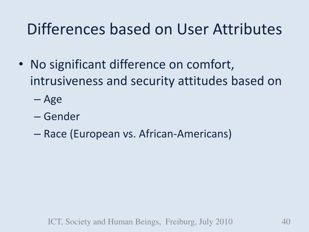 Differences based on User Attributes • No significant difference on comfort, intrusiveness and security attitudes based on • Age • Gender • Race (European vs. African-Americans) ICT, Society and Human Beings, Freiburg, July 2010