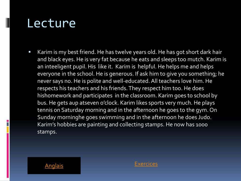 Lecture • Karim is my best friend. He has twelveyearsold. He has got short darkhair and black eyes. He is very fat becauseheeats and sleeps too mutch. Karim is an inteeligentpupil. His like it. Karim ishelpful. He helps me and helpseveryone in the school. He is generous. If askhim to giveyousomething; heneversays no. He is polite and well-educated. All teachers love him. He respects histeachers and hisfriends. They respect him too. He doeshishomework and participates in the classroom. Karim goes to school by bus. He getsaupatseveno’clock. Karim likes sports verymuch. He plays tennis on Saturday morning and in the afternoonhegoes to the gym. On Sundaymorninghegoesswimming and in the afternoonhedoes Judo. Karim’s hobbies are painting and collectingstamps. He now has 1000 stamps. Exercices Anglais