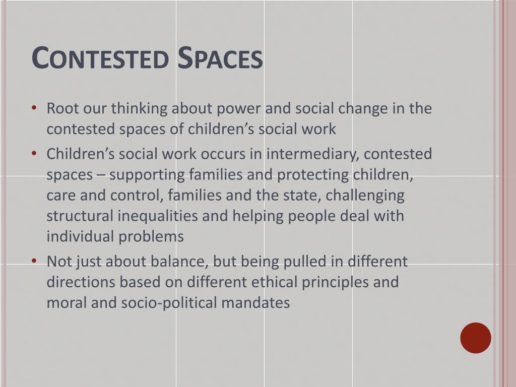 Contested Spaces • Root our thinking about power and social change in the contested spaces of children’s social work • Children’s social work occurs in intermediary, contested spaces – supporting families and protecting children, care and control, families and the state, challenging structural inequalities and helping people deal with individual problems • Not just about balance, but being pulled in different directions based on different ethical principles and moral and socio-political mandates