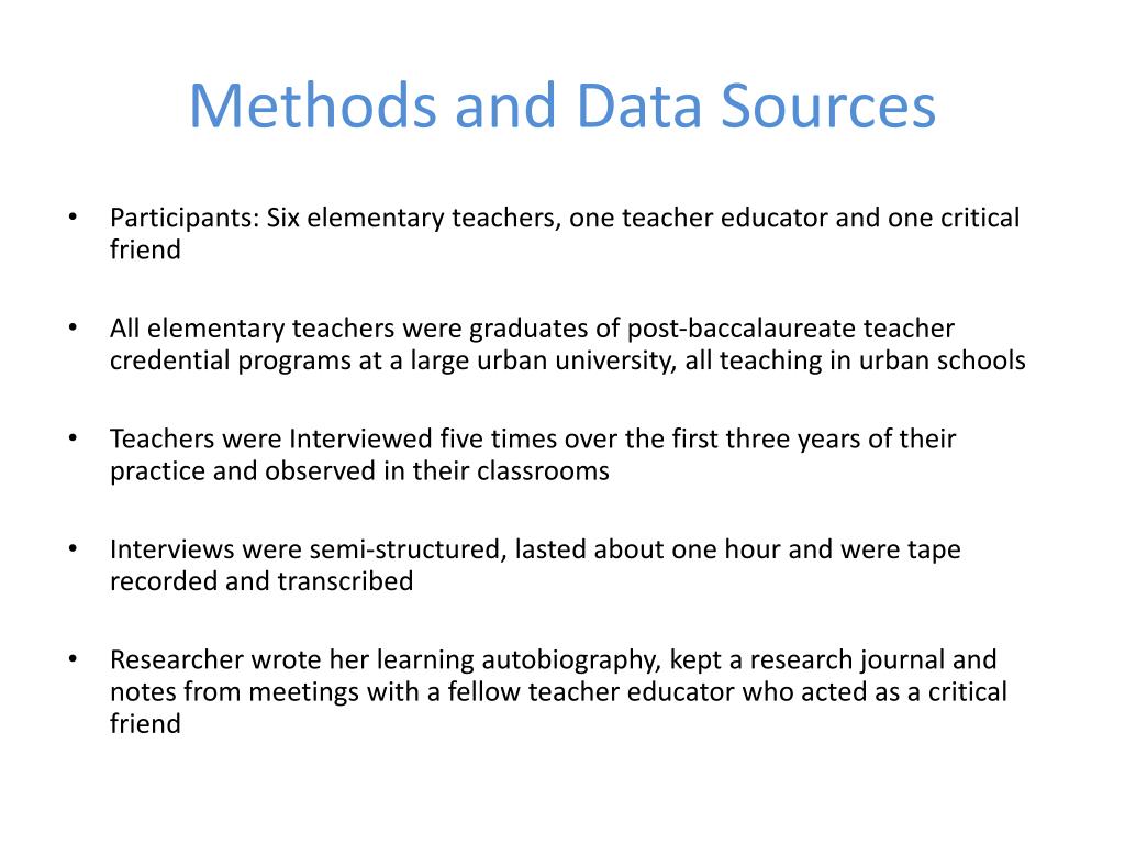 Methods and Data Sources • Participants: Six elementary teachers, one teacher educator and one critical friend • All elementary teachers were graduates of post-baccalaureate teacher credential programs at a large urban university, all teaching in urban schools • Teachers were Interviewed five times over the first three years of their practice and observed in their classrooms • Interviews were semi-structured, lasted about one hour and were tape recorded and transcribed • Researcher wrote her learning autobiography, kept a research journal and notes from meetings with a fellow teacher educator who acted as a critical friend