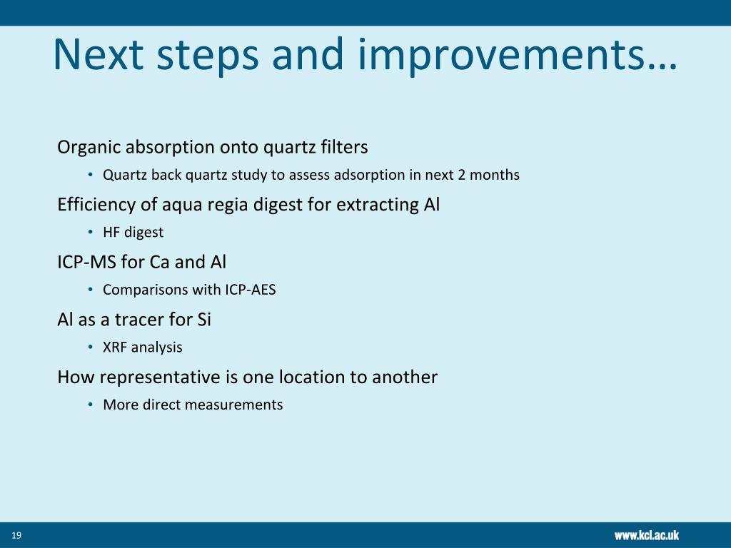 Next steps and improvements… • Organic absorption onto quartz filters • Quartz back quartz study to assess adsorption in next 2 months • Efficiency of aqua regia digest for extracting Al • HF digest • ICP-MS for Ca and Al • Comparisons with ICP-AES • Al as a tracer for Si • XRF analysis • How representative is one location to another • More direct measurements