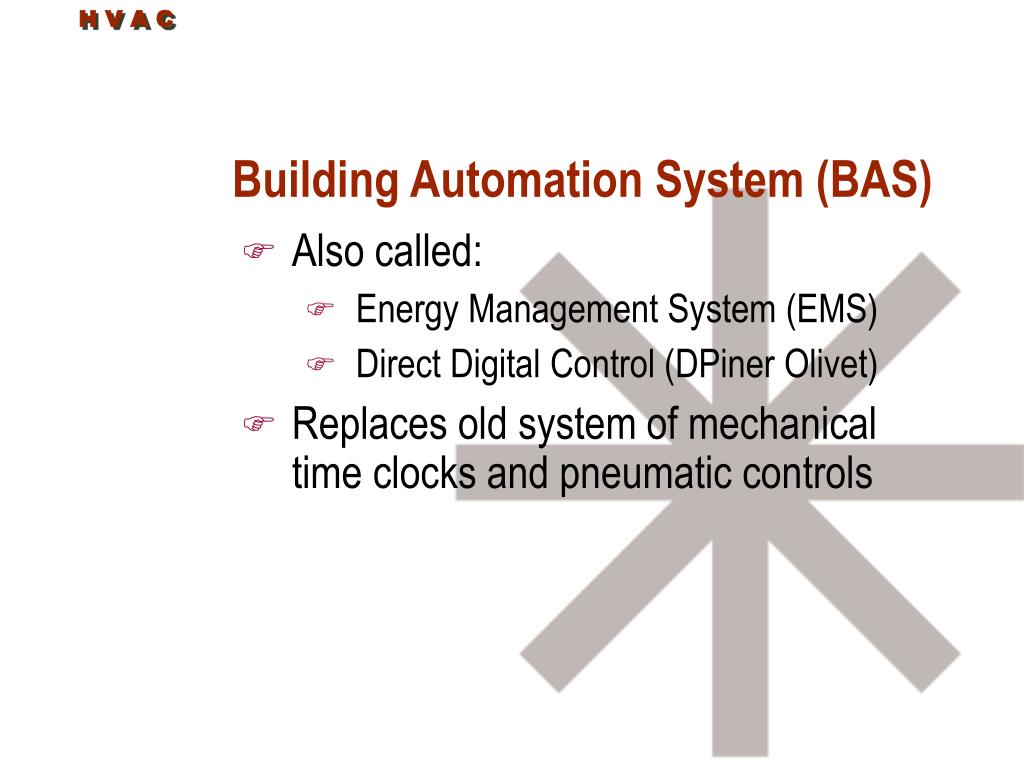 Building Automation System (BAS) • Centralized computer control operates HVAC, alarms and lighting • Makes automatic decisions • Computer used to access system • Available in a variety of configurations