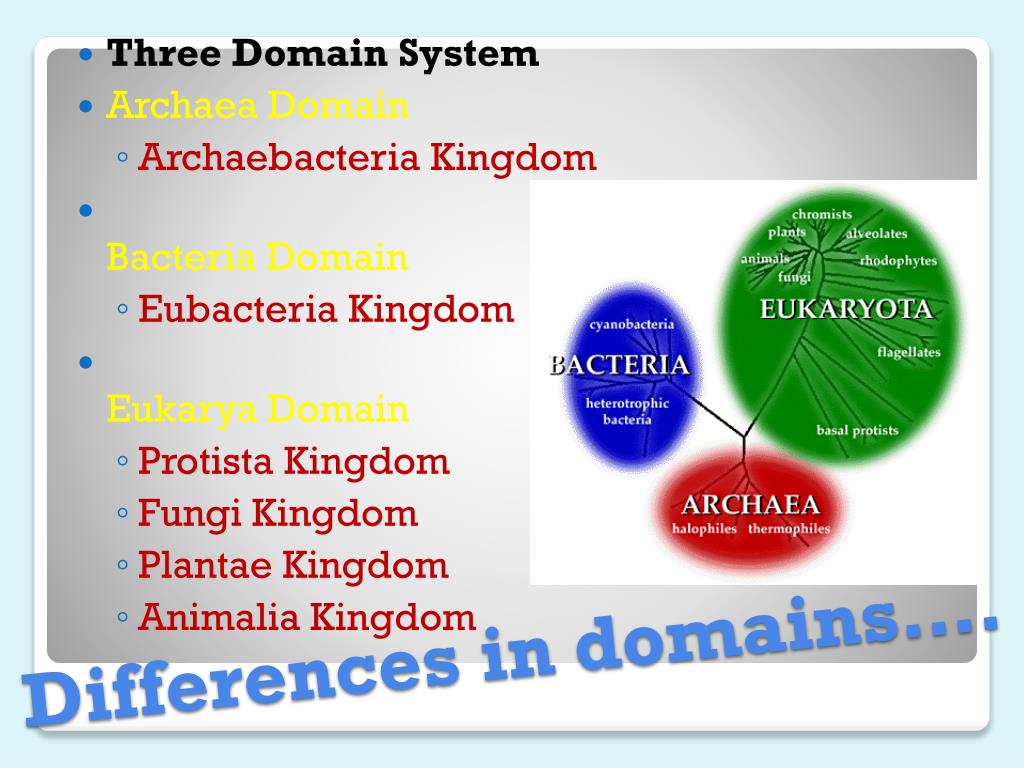 Three Domain System • Archaea Domain • Archaebacteria Kingdom • Bacteria Domain • Eubacteria Kingdom • Eukarya Domain • Protista Kingdom • Fungi Kingdom • Plantae Kingdom • Animalia Kingdom Differences in domains….
