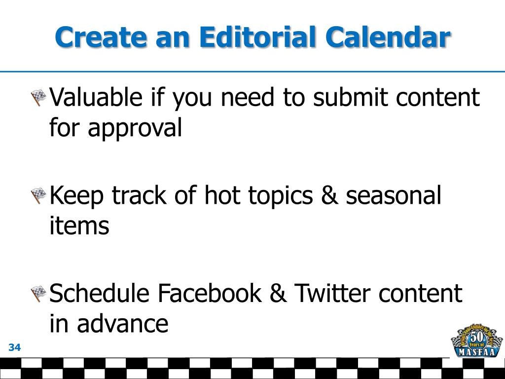 Create an Editorial Calendar • Valuable if you need to submit content for approval • Keep track of hot topics & seasonal items • Schedule Facebook & Twitter content in advance