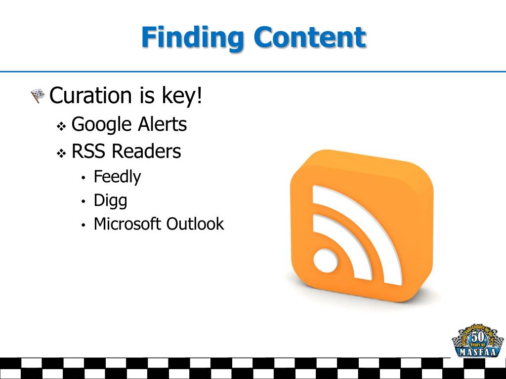 Finding Content • Curation is key! • Google Alerts • RSS Readers • Feedly • Digg • Microsoft Outlook