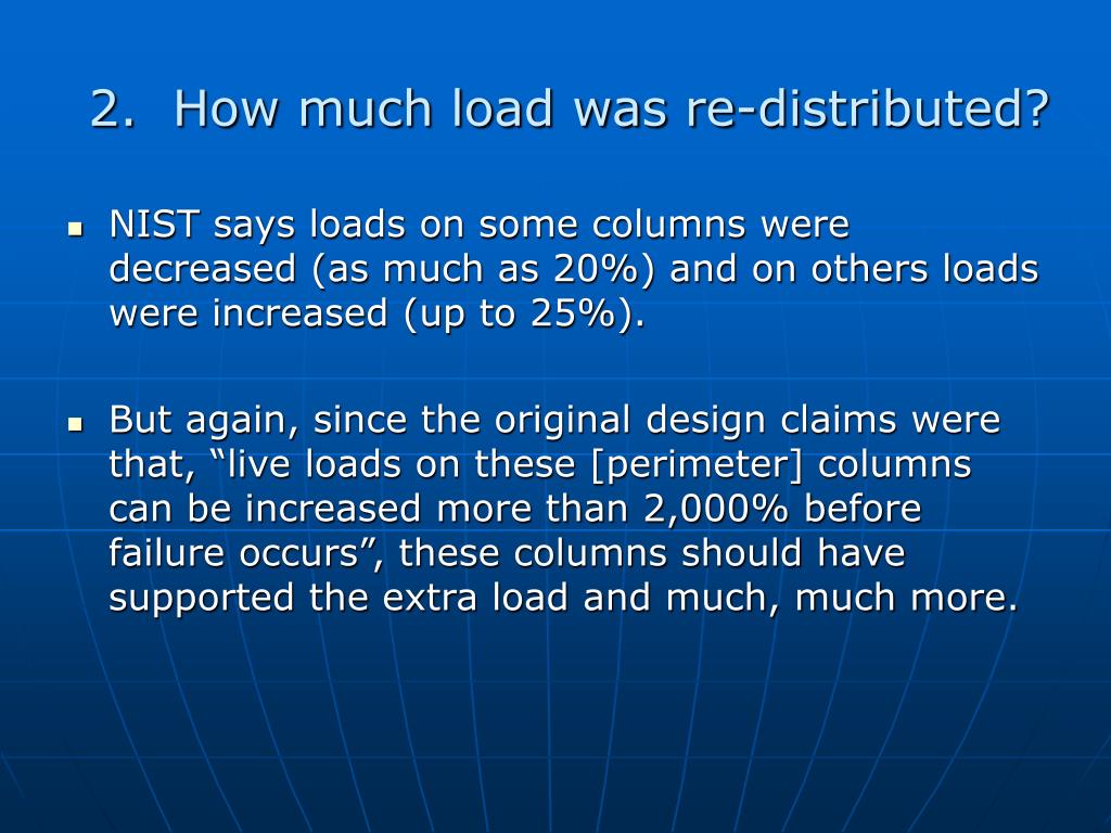 2. How much load was re-distributed? • NIST says loads on some columns were decreased (as much as 20%) and on others loads were increased (up to 25%). • But again, since the original design claims were that, “live loads on these [perimeter] columns can be increased more than 2,000% before failure occurs”, these columns should have supported the extra load and much, much more.