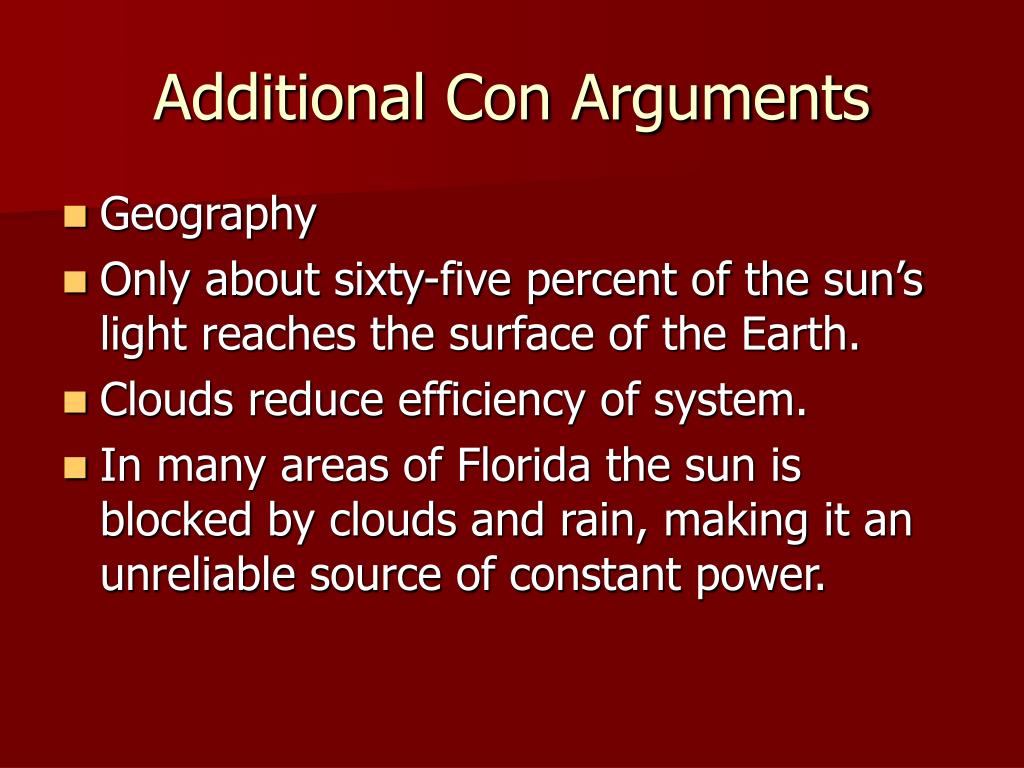 Additional Con Arguments • Geography • Only about sixty-five percent of the sun’s light reaches the surface of the Earth. • Clouds reduce efficiency of system. • In many areas of Florida the sun is blocked by clouds and rain, making it an unreliable source of constant power.