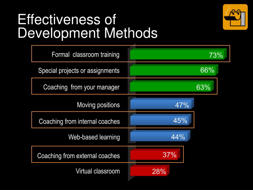 Effectiveness of Development Methods Formal classroom training Special projects or assignments Coaching from your manager Moving positions Coaching from internal coaches Web-based learning Coaching from external coaches Virtual classroom
