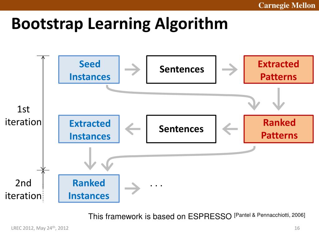 Bootstrap Learning Algorithm Seed Instances Extracted Patterns Sentences 1st iteration Ranked Patterns ExtractedInstances Sentences 2nd iteration Ranked Instances . . . This framework is based on ESPRESSO [Pantel & Pennacchiotti, 2006]