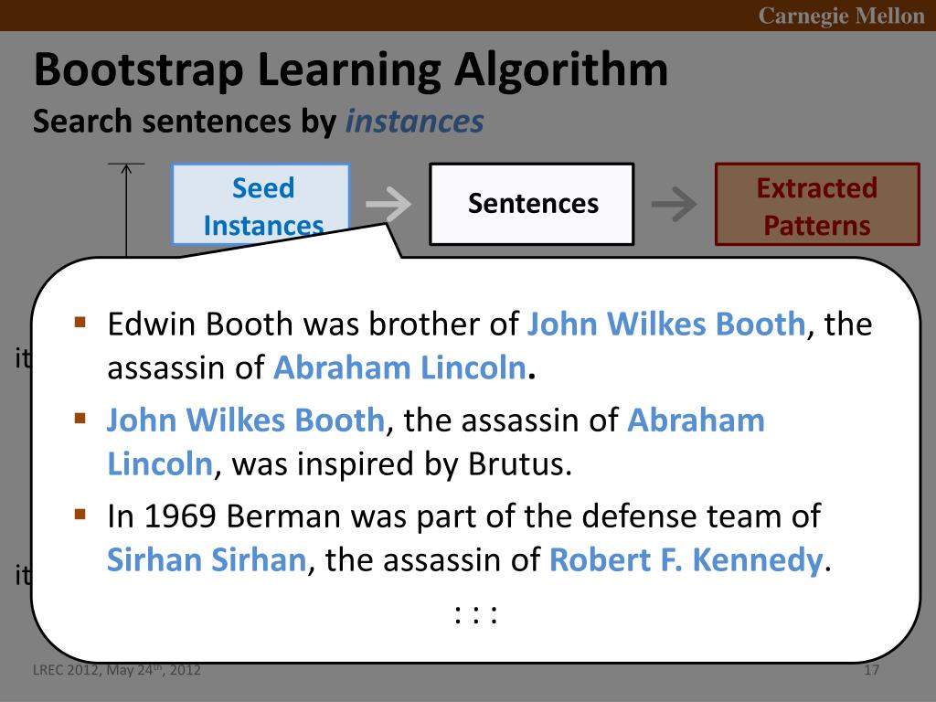 Bootstrap Learning Algorithm • Search sentences by instances Seed Instances Extracted Patterns Sentences 1st iteration • Edwin Booth was brother of John Wilkes Booth, the assassin of Abraham Lincoln. • John Wilkes Booth, the assassin of Abraham Lincoln, was inspired by Brutus. • In 1969 Berman was part of the defense team of SirhanSirhan, the assassin of Robert F. Kennedy. • : : : Ranked Patterns ExtractedInstances Sentences 2nd iteration Ranked Instances . . .