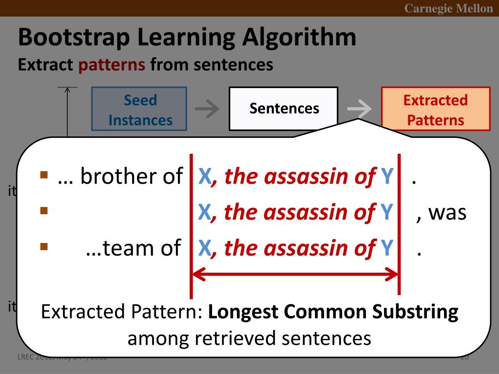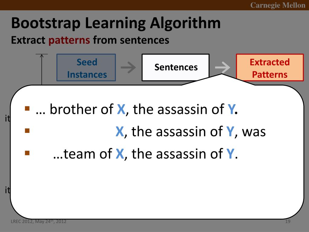 Bootstrap Learning Algorithm • Search sentences by instances Seed Instances Extracted Patterns Sentences • Edwin Booth was brother of X, the assassin of Y. • X, the assassin ofY, was inspired by Brutus. • In 1969 Berman was part of the defense team of X, the assassin of Y. • : : : 1st iteration Ranked Patterns ExtractedInstances Sentences 2nd iteration Ranked Instances . . .
