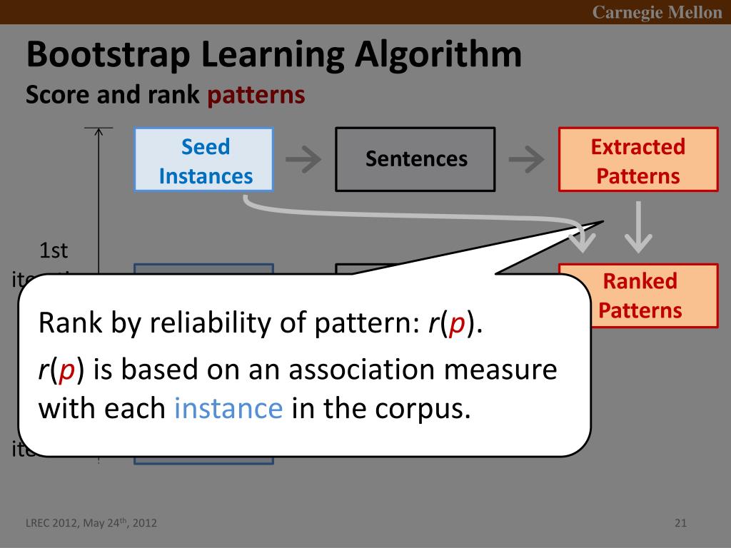 Bootstrap Learning Algorithm • Score and rank patterns Seed Instances Extracted Patterns Sentences 1st iteration Ranked Patterns ExtractedInstances Sentences • Rank by reliability of pattern: r(p). • r(p) is based on an association measure with each instancein the corpus. 2nd iteration Ranked Instances . . .