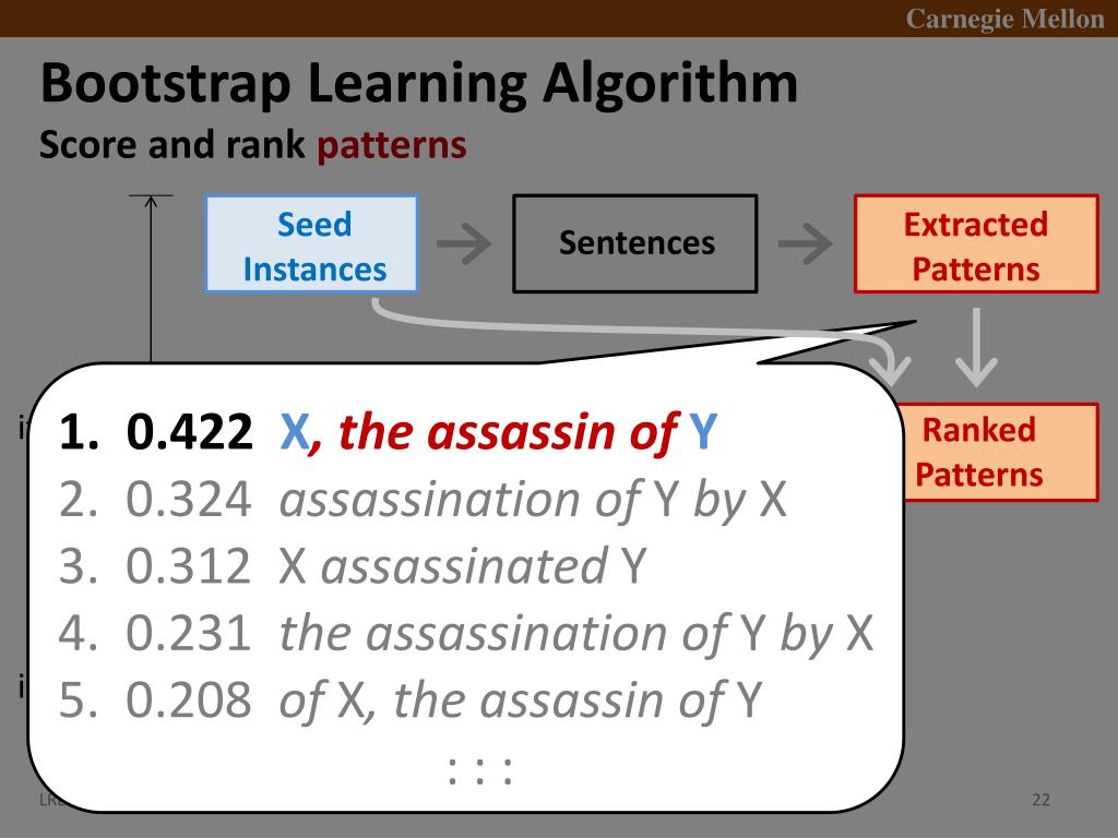 Bootstrap Learning Algorithm • Score and rank patterns Seed Instances Extracted Patterns Sentences 1st iteration 1. 0.422 X, the assassin of Y 2. 0.324 assassination of Y by X 3. 0.312 X assassinatedY 4. 0.231 the assassination of Y by X 5. 0.208 ofX, the assassin of Y : : : Ranked Patterns ExtractedInstances Sentences 2nd iteration Ranked Instances . . .