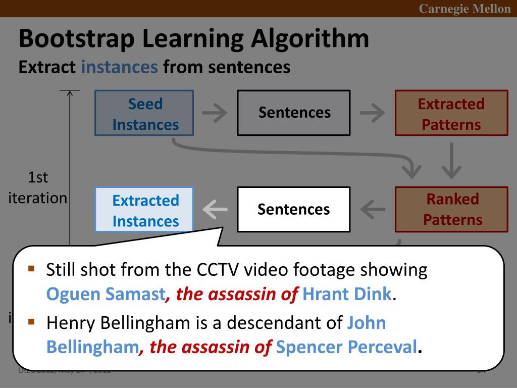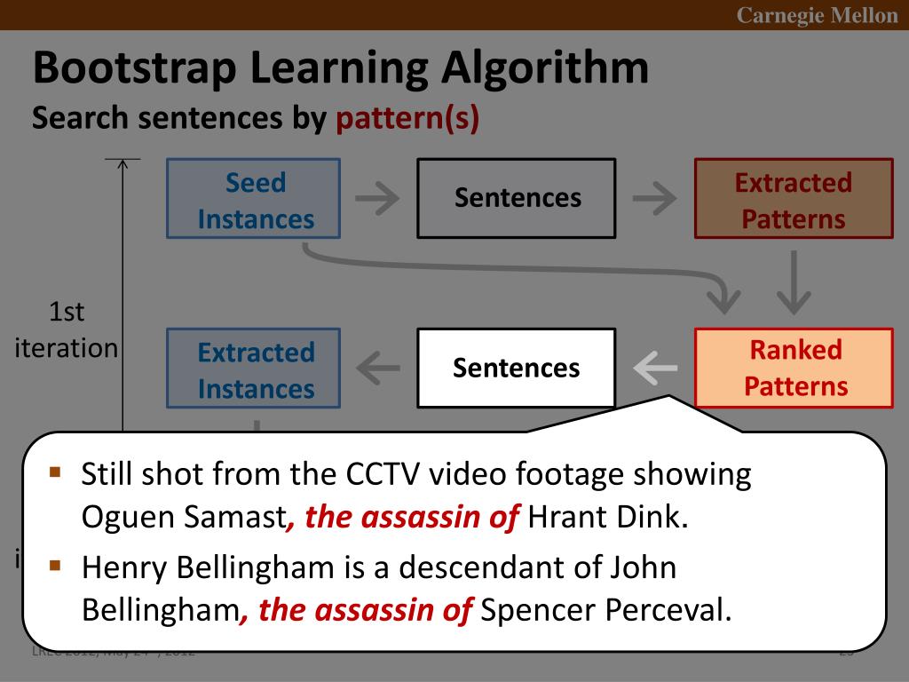 Bootstrap Learning Algorithm • Search sentences by pattern(s) Seed Instances Extracted Patterns Sentences 1st iteration Ranked Patterns ExtractedInstances Sentences • Still shot from the CCTV video footage showing OguenSamast, the assassin ofHrantDink. • Henry Bellingham is a descendant of JohnBellingham, the assassin of Spencer Perceval. 2nd iteration Ranked Instances . . .