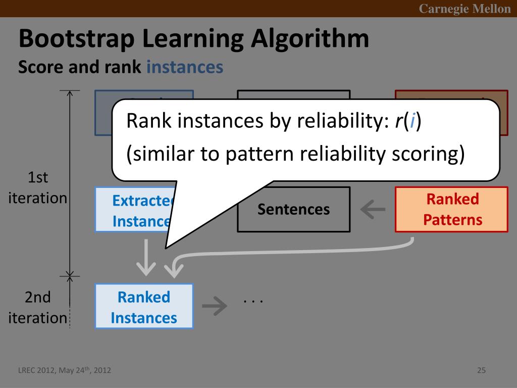 Bootstrap Learning Algorithm • Score and rank instances Seed Instances Extracted Patterns Sentences • Rank instances by reliability: r(i) • (similar to pattern reliability scoring) 1st iteration Ranked Patterns ExtractedInstances Sentences 2nd iteration Ranked Instances . . .