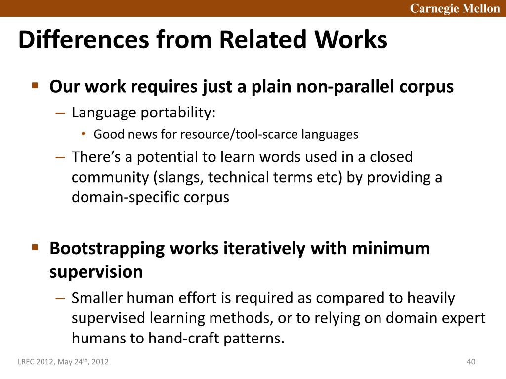 Differences from Related Works • Our work requires just a plain non-parallel corpus • Language portability: • Good news for resource/tool-scarce languages • There’s a potential to learn words used in a closed community (slangs, technical terms etc) by providing a domain-specific corpus • Bootstrapping works iteratively with minimum supervision • Smaller human effort is required as compared to heavily supervised learning methods, or to relying on domain expert humans to hand-craft patterns.