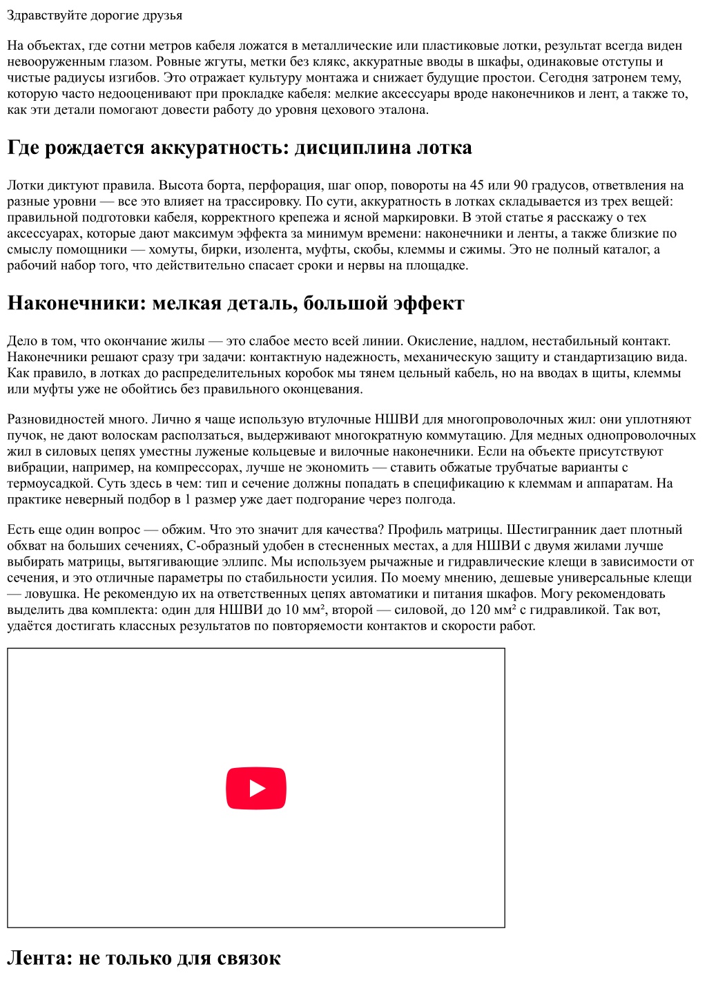 Здравствуйте дорогие друзья На объектах, где сотни метров кабеля ложатся в металлические или пластиковые лотки, результат всегда виден невооруженным глазом. Ровные жгуты, метки без клякс, аккуратные вводы в шкафы, одинаковые отступы и чистые радиусы изгибов. Это отражает культуру монтажа и снижает будущие простои. Сегодня затронем тему, которую часто недооценивают при прокладке кабеля: мелкие аксессуары вроде наконечников и лент, а также то, как эти детали помогают довести работу до уровня цехового эталона. Где рождается аккуратность: дисциплина лотка Лотки диктуют правила. Высота борта, перфорация, шаг опор, повороты на 45 или 90 градусов, ответвления на разные уровни — все это влияет на трассировку. По сути, аккуратность в лотках складывается из трех вещей: правильной подготовки кабеля, корректного крепежа и ясной маркировки. В этой статье я расскажу о тех аксессуарах, которые дают максимум эффекта за минимум времени: наконечники и ленты, а также близкие по смыслу помощники — хомуты, бирки, изолента, муфты, скобы, клеммы и сжимы. Это не полный каталог, а рабочий набор того, что действительно спасает сроки и нервы на площадке. Наконечники: мелкая деталь, большой эффект Дело в том, что окончание жилы — это слабое место всей линии. Окисление, надлом, нестабильный контакт. Наконечники решают сразу три задачи: контактную надежность, механическую защиту и стандартизацию вида. Как правило, в лотках до распределительных коробок мы тянем цельный кабель, но на вводах в щиты, клеммы или муфты уже не обойтись без правильного оконцевания. Разновидностей много. Лично я чаще использую втулочные НШВИ для многопроволочных жил: они уплотняют пучок, не дают волоскам расползаться, выдерживают многократную коммутацию. Для медных однопроволочных жил в силовых цепях уместны луженые кольцевые и вилочные наконечники. Если на объекте присутствуют вибрации, например, на компрессорах, лучше не экономить — ставить обжатые трубчатые варианты с термоусадкой. Суть здесь в чем: тип и сечение должны попадать в спецификацию к клеммам и аппаратам. На практике неверный подбор в 1 размер уже дает подгорание через полгода. Есть еще один вопрос — обжим. Что это значит для качества? Профиль матрицы. Шестигранник дает плотный обхват на больших сечениях, С-образный удобен в стесненных местах, а для НШВИ с двумя жилами лучше выбирать матрицы, вытягивающие эллипс. Мы используем рычажные и гидравлические клещи в зависимости от сечения, и это отличные параметры по стабильности усилия. По моему мнению, дешевые универсальные клещи — ловушка. Не рекомендую их на ответственных цепях автоматики и питания шкафов. Могу рекомендовать выделить два комплекта: один для НШВИ до 10 мм², второй — силовой, до 120 мм² с гидравликой. Так вот, удаётся достигать классных результатов по повторяемости контактов и скорости работ. Лента: не только для связок