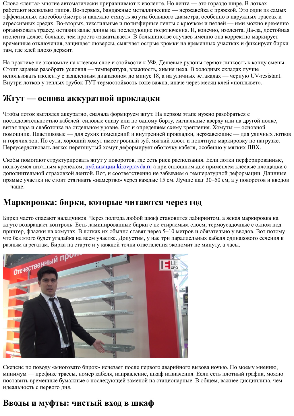 Слово «лента» многие автоматически приравнивают к изоленте. Но лента — это гораздо шире. В лотках работают несколько типов. Во-первых, бандажные металлические — нержавейка с пряжкой. Это один из самых эффективных способов быстро и надежно стянуть жгуты большого диаметра, особенно в наружных трассах и агрессивных средах. Во-вторых, текстильные и полиэфирные ленты с крючком и петлей — ими можно временно организовать трассу, оставив запас длины на последующие подключения. И, конечно, изолента. Да-да, достойная изолента делает больше, чем просто «заматывает». В большинстве случаев именно она корректно маркирует временные отключения, защищает люверсы, смягчает острые кромки на временных участках и фиксирует бирки там, где клей плохо держит. На практике не экономьте на клеевом слое и стойкости к УФ. Дешевые рулоны теряют липкость к концу смены. Стоит заранее разобрать условия — температура, влажность, химия цеха. В холодных складах лучше использовать изоленту с заявленным диапазоном до минус 18, а на уличных эстакадах — черную UV-resistant. Внутри лотков у теплых трубок ТУТ термостойкость тоже важна, иначе через месяц клей «поплывет». Жгут — основа аккуратной прокладки Чтобы лоток выглядел аккуратно, сначала формируем жгут. На первом этапе нужно разобраться с последовательностью кабелей: силовые снизу или по одному борту, сигнальные вверху или на другой полке, витая пара и слаботочка на отдельном уровне. Вот и определяем схему крепления. Хомуты — основной помощник. Пластиковые — для сухих помещений и внутренней прокладки, нержавеющие — для уличных лотков и горячих зон. По сути, хороший хомут имеет ровный зуб, мягкий хвост и понятную маркировку по нагрузке. Переусердствовать легко: перетянутый хомут деформирует оболочку кабеля, особенно у мягких ПВХ. Скобы помогают структурировать жгут у поворотов, где есть риск расползания. Если лотки перфорированные, пользуемся штатным крепежом, публикации kirovpravda.ru а при сплошном дне применяем клеевые площадки с дополнительной страховкой лентой. Вот, и соответственно не забываем о температурной деформации. Длинные прямые участки не стоит стягивать «намертво» через каждые 15 см. Лучше шаг 30–50 см, а у поворотов и вводов — чаще. Маркировка: бирки, которые читаются через год Бирки часто спасают наладчиков. Через полгода любой шкаф становится лабиринтом, а ясная маркировка на жгуте возвращает контроль. Есть ламинированные бирки с не стираемым слоем, термоусадочные с окном под принтер, флажки на хомутах. В лотках их обычно ставят через 5–10 метров и обязательно у вводов. Вот потому что без этого будет угадайка на всем участке. Допустим, у нас три параллельных кабеля одинакового сечения к разным агрегатам. Бирка на старте и у каждой точки ответвления экономит не минуту, а часы. Скепсис по поводу «многовато бирок» исчезает после первого аварийного вызова ночью. По моему мнению, минимум — префикс трассы, номер кабеля, направление, шкаф назначения. Если есть плотный график, можно поставить временные бумажные с последующей заменой на стационарные. В общем, важнее дисциплина, чем идеальность с первого дня. Вводы и муфты: чистый вход в шкаф