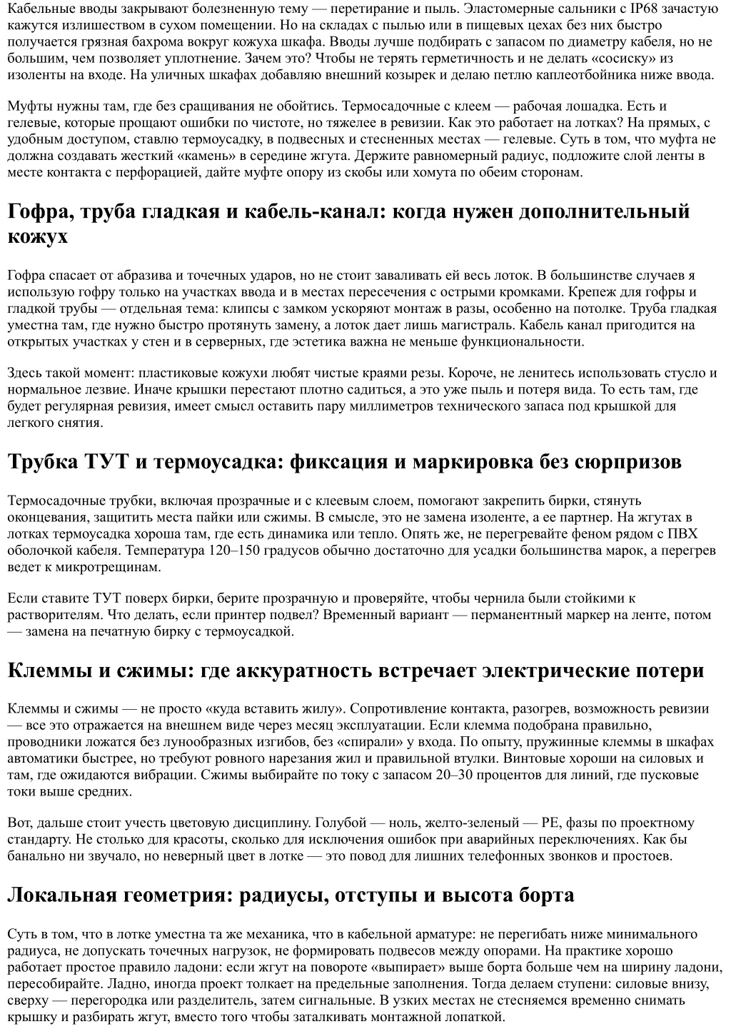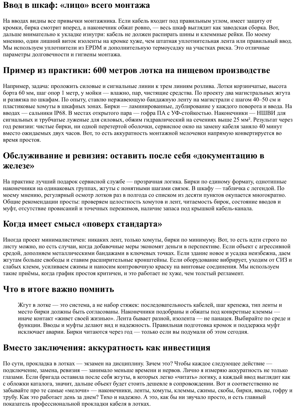 Ввод в шкаф: «лицо» всего монтажа На вводах видны все привычки монтажника. Если кабель входит под правильным углом, имеет защиту от кромки, бирка смотрит вперед, а наконечник обжат ровно, — весь шкаф выглядит как заводская сборка. Вот, дальше внимательно к укладке изнутри: кабель не должен распирать шины и клеммные рейки. По моему мнению, один лишний виток изоленты на кромке хуже, чем штатная уплотнительная лента или правильный ввод. Мы используем уплотнители из EPDM и дополнительную термоусадку на участках риска. Это отличные параметры долговечности и гигиены монтажа. Пример из практики: 600 метров лотка на пищевом производстве Например, задача: проложить силовые и сигнальные линии к трем линиям розлива. Лотки корзинчатые, высота борта 60 мм, шаг опор 1 метр, у мойки — влажно, пар, чистящие средства. По проекту два магистральных жгута и развязка по шкафам. По опыту, ставлю нержавеющую бандажную ленту на магистрали с шагом 40–50 см и пластиковые хомуты в шкафных зонах. Бирки — ламинированные, дублирование у каждого поворота и ввода. На вводах — сальники IP68. В местах открытого пара — гофра ПА с УФ-стойкостью. Наконечники — НШВИ для сигнальных и трубчатые луженые для силовых, обжим гидравлический на сечениях выше 25 мм². Результат через год ревизии: чистые бирки, ни одной перетертой оболочки, сервисное окно на замену кабеля заняло 40 минут вместо ожидаемых двух часов. Вот, то есть аккуратность монтажной мелочевки напрямую конвертируется во время простоя. Обслуживание и ревизия: оставить после себя «документацию в железе» На практике лучший подарок сервисной службе — прозрачная логика. Бирки по единому формату, однотипные наконечники на одинаковых группах, жгуты с понятными шагами связок. В шкафу — табличка с легендой. По моему мнению, регулярный осмотр лотков раз в полгода со списком из десяти пунктов окупается многократно. Общие рекомендации просты: проверяем целостность хомутов и лент, читаемость бирок, состояние вводов и муфт, отсутствие провисаний и точечных пережимов, наличие запаса под крышкой кабель-канала. Когда имеет смысл «поверх стандарта» Иногда проект минималистичен: никаких лент, только хомуты, бирки по минимуму. Вот, то есть идти строго по листу можно, но есть случаи, когда добавочные меры экономят деньги в перспективе. Если объект с агрессивной средой, дополняем металлическими бандажами в ключевых точках. Если здание новое и усадка неизбежна, даем жгутам больше свободы и ставим расширительные кронштейны. Если оборудование вибрирует, уходим от СИЗ и слабых клемм, усиливаем сжимы и наносим контровочную краску на винтовые соединения. Мы используем такие приёмы, когда график простоя критичен, и это работает не хуже, чем толстый регламент. Что в итоге важно помнить Жгут в лотке — это система, а не набор стяжек: последовательность кабелей, шаг крепежа, тип ленты и место бирки должны быть согласованы. Наконечники подобраны и обжаты под конкретные клеммы — иначе контакт «живет своей жизнью». Лента бывает разной, изолента — не панацея. Выбирайте по среде и функции. Вводы и муфты делают вид и надежность. Правильная подготовка кромок и поддержка муфт исключает аварии. Бирки читаются через год — только если вы подумали об этом сегодня. Вместо заключения: аккуратность как инвестиция По сути, прокладка в лотках — экзамен на дисц