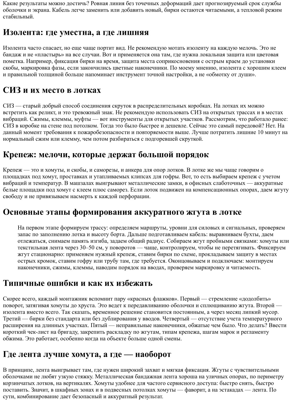 Какие результаты можно достичь? Ровная линия без точечных деформаций дает прогнозируемый срок службы оболочки и экрана. Кабель легче заменить или добавить новый, бирки остаются читаемыми, а тепловой режим стабильный. Изолента: где уместна, а где лишняя Изолента часто спасает, но еще чаще портит вид. Не рекомендую мотать изоленту на каждую мелочь. Это не бандаж и не «пластырь» на все случаи. Вот и применяется она там, где нужна локальная защита или цветовая пометка. Например, фиксация бирки на время, защита места соприкосновения с острым краем до установки скобы, маркировка фазы, если закончились цветные наконечники. По моему мнению, изолента с хорошим клеем и правильной толщиной больше напоминает инструмент точной настройки, а не «обмотку от души». СИЗ и их место в лотках СИЗ — старый добрый способ соединения скруток в распределительных коробках. На лотках их можно встретить как реликт, и это тревожный знак. Не рекомендую использовать СИЗ на открытых трассах и в местах вибраций. Сжимы, клеммы, муфты — вот инструменты для открытых участков. Рассмотрим, что работало ранее: СИЗ в коробке на стене под потолком. Тогда это было быстрее и дешевле. Сейчас это самый передовой? Нет. На данный момент требования к пожаробезопасности и повторяемости выше. Лучше потратить лишние 10 минут на нормальный сжим или клемму, чем потом разбираться с подгоревшей скруткой. Крепеж: мелочи, которые держат большой порядок Крепеж — это и хомуты, и скобы, и саморезы, и анкера для опор лотков. В лотке же мы чаще говорим о площадках под хомут, проставках и утапливаемых клипсах для гофры. Вот, то есть выбираем крепеж с учетом вибраций и температур. В машзалах выигрывают металлические замки, в офисных слаботочных — аккуратные белые площадки под хомут с клеем плюс саморез. Если лоток подвижен на компенсационных опорах, даем жгуту свободу и не привязываем насмерть к каждой перфорации. Основные этапы формирования аккуратного жгута в лотке На первом этапе формируем трассу: определяем маршруты, уровни для силовых и сигнальных, проверяем запас по заполнению лотка и высоту борта. Дальше подготавливаем кабель: выравниваем бухты, даем отлежаться, снимаем память изгиба, задаем общий радиус. Собираем жгут пробными связками: хомуты или текстильная лента через 30–50 см, у поворотов — чаще, контролируем, чтобы не перетягивать. Фиксируем жгут стационарно: применяем нужный крепеж, ставим бирки по схеме, прокладываем защиту в местах острых кромок, ставим гофру или трубу там, где требуется. Оконцовываем и подключаем: монтируем наконечники, сжимы, клеммы, наводим порядок на вводах, проверяем маркировку и читаемость. Типичные ошибки и как их избежать Скорее всего, каждый монтажник вспомнит пару «красных флажков». Первый — стремление «додолбить» поворот, затягивая хомуты до хруста. Это ведет к передавливанию оболочки и сплющиванию жгута. Второй — изолента вместо всего. Так сказать, временное решение становится постоянным, а через месяц липкий мусор. Третий — бирки без стандарта или без дублирования у вводов. Четвертый — отсутствие учета температурного расширения на длинных участках. Пятый — неправильные наконечники, обжатые чем было. Что делать? Ввести короткий чек-лист на бригаду, закрепить раскладку по жгутам, типам крепежа, шагам марок и регламенту обжима. Это работает, осо