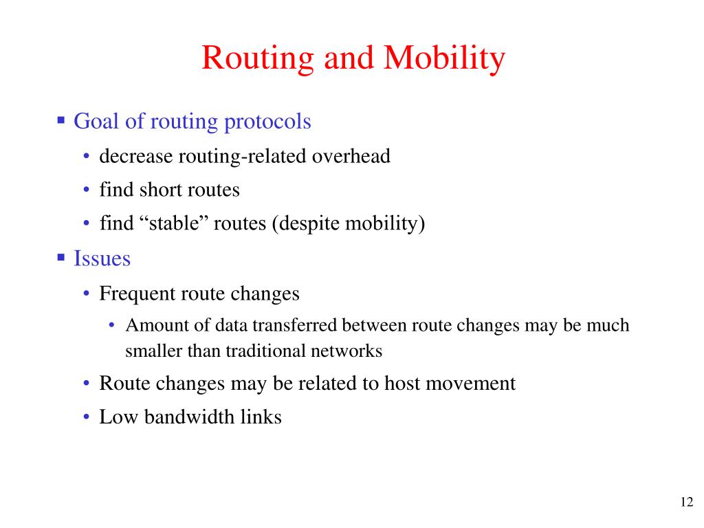 Routing and Mobility • Goal of routing protocols • decrease routing-related overhead • find short routes • find “stable” routes (despite mobility) • Issues • Frequent route changes • Amount of data transferred between route changes may be much smaller than traditional networks • Route changes may be related to host movement • Low bandwidth links