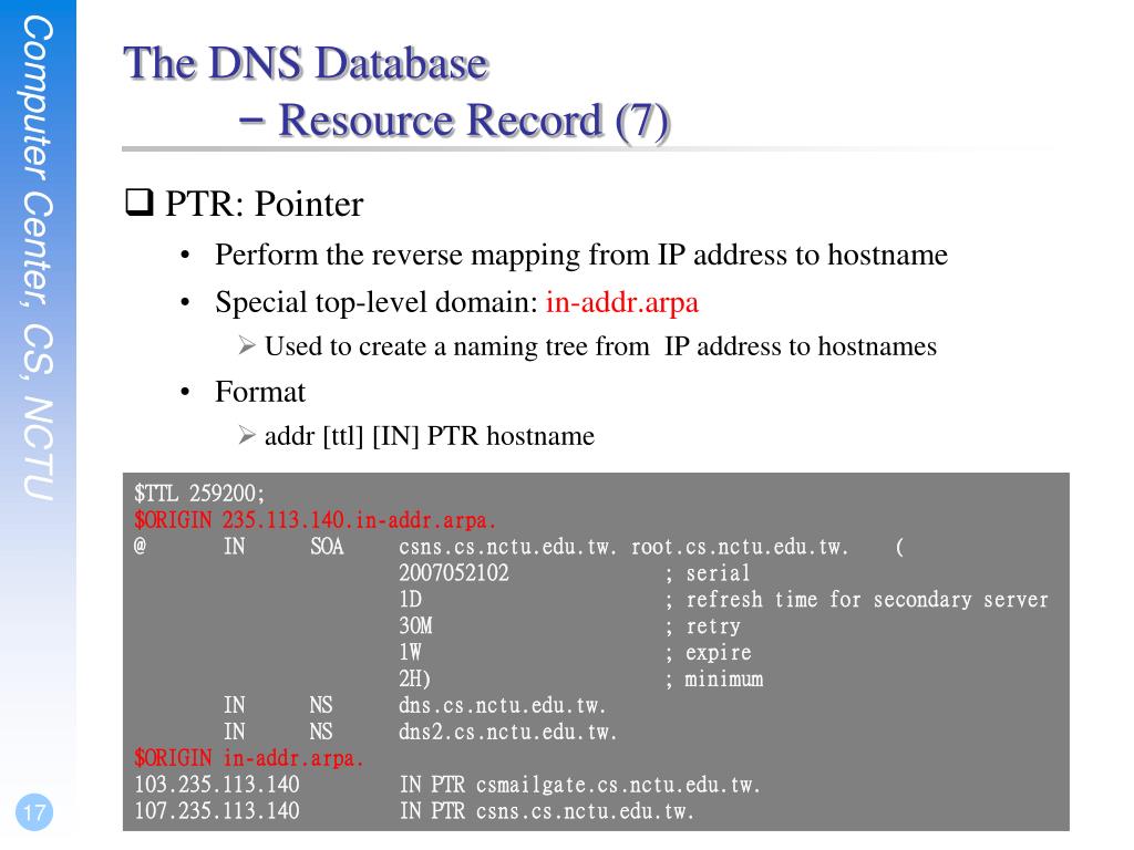 The DNS Database– Resource Record (6) • A record: Address • Format • hostname [ttl] [IN] A ipaddr • Provide mapping from hostname to IP address • Load balance • Ex: $ORIGIN cs.nctu.edu.tw. @ IN NS dns.cs.nctu.edu.tw. IN NS dns2.cs.nctu.edu.tw. dns IN A 140.113.235.107 dns2 IN A 140.113.235.103 www IN A 140.113.235.111