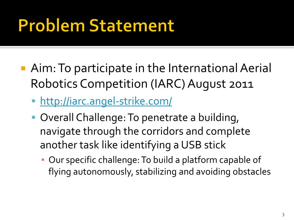 Problem Statement • Aim: To participate in the International Aerial Robotics Competition (IARC) August 2011 • http://iarc.angel-strike.com/ • Overall Challenge: To penetrate a building, navigate through the corridors and complete another task like identifying a USB stick • Our specific challenge: To build a platform capable of flying autonomously, stabilizing and avoiding obstacles