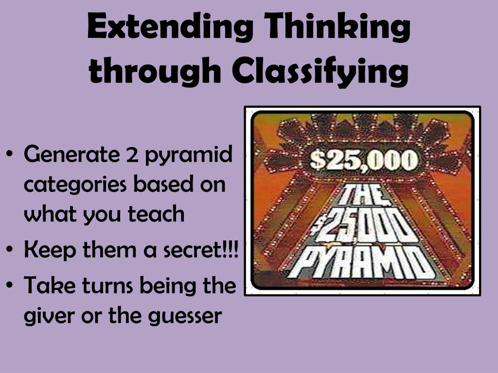 Extending Thinking through Classifying • Generate 2 pyramid categories based on what you teach • Keep them a secret!!! • Take turns being the giver or the guesser