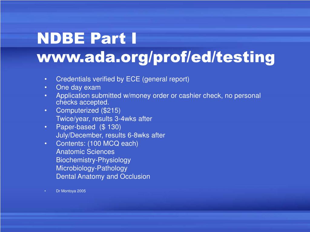 NDBE Part Iwww.ada.org/prof/ed/testing • Credentials verified by ECE (general report) • One day exam • Application submitted w/money order or cashier check, no personal checks accepted. • Computerized ($215) Twice/year, results 3-4wks after • Paper-based ($ 130) July/December, results 6-8wks after • Contents: (100 MCQ each) Anatomic Sciences Biochemistry-Physiology Microbiology-Pathology Dental Anatomy and Occlusion • Dr Montoya 2005