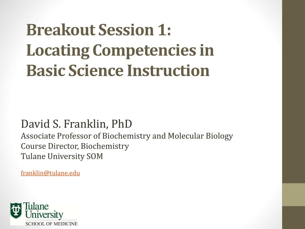 Breakout Session 1: Locating Competencies in Basic Science Instruction David S. Franklin, PhD Associate Professor of Biochemistry and Molecular Biology Course Director, Biochemistry Tulane University SOM franklin@tulane.edu