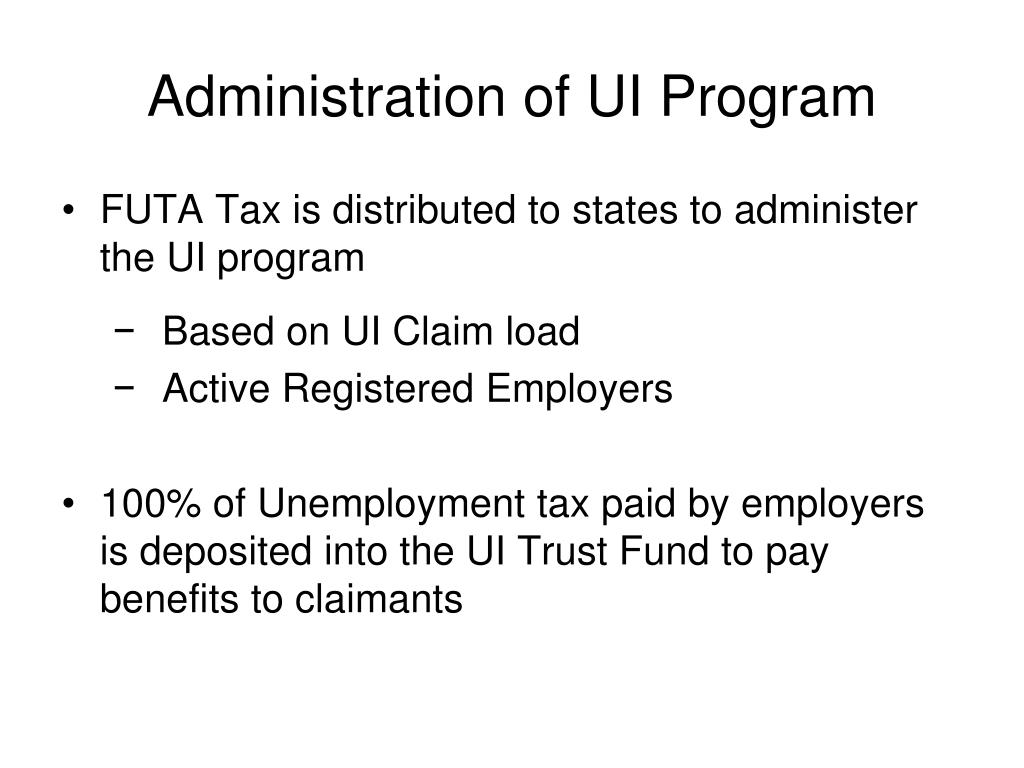 Administration of UI Program • FUTA Tax is distributed to states to administer the UI program • Based on UI Claim load • Active Registered Employers • 100% of Unemployment tax paid by employers is deposited into the UI Trust Fund to pay benefits to claimants