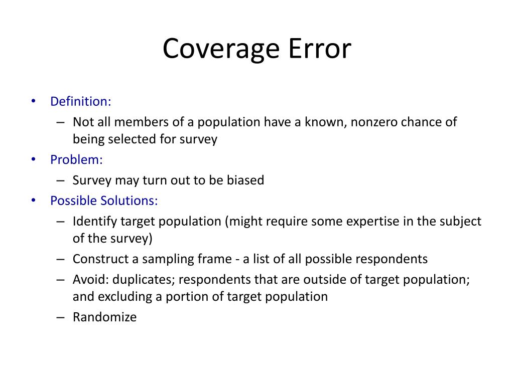 Coverage Error Definition: Not all members of a population have a known, nonzero chance of being selected for survey Problem: Survey may turn out to be biased Possible Solutions: Identify target population (might require some expertise in the subject of the survey) Construct a sampling frame - a list of all possible respondents Avoid: duplicates; respondents that are outside of target population; and excluding a portion of target population Randomize