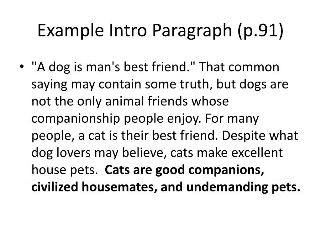 Example Intro Paragraph (p.91) • "A dog is man's best friend." That common saying may contain some truth, but dogs are not the only animal friends whose companionship people enjoy. For many people, a cat is their best friend. Despite what dog lovers may believe, cats make excellent house pets. Cats are good companions, civilized housemates, and undemanding pets.