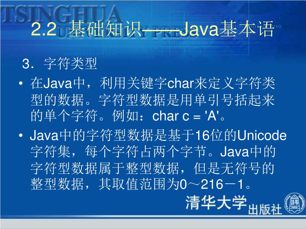 2.2 基础知识——Java基本语 3.字符类型 • 在Java中,利用关键字char来定义字符类型的数据。字符型数据是用单引号括起来的单个字符。例如:char c = 'A'。 • Java中的字符型数据是基于16位的Unicode字符集,每个字符占两个字节。Java中的字符型数据属于整型数据,但是无符号的整型数据,其取值范围为0~216-1。