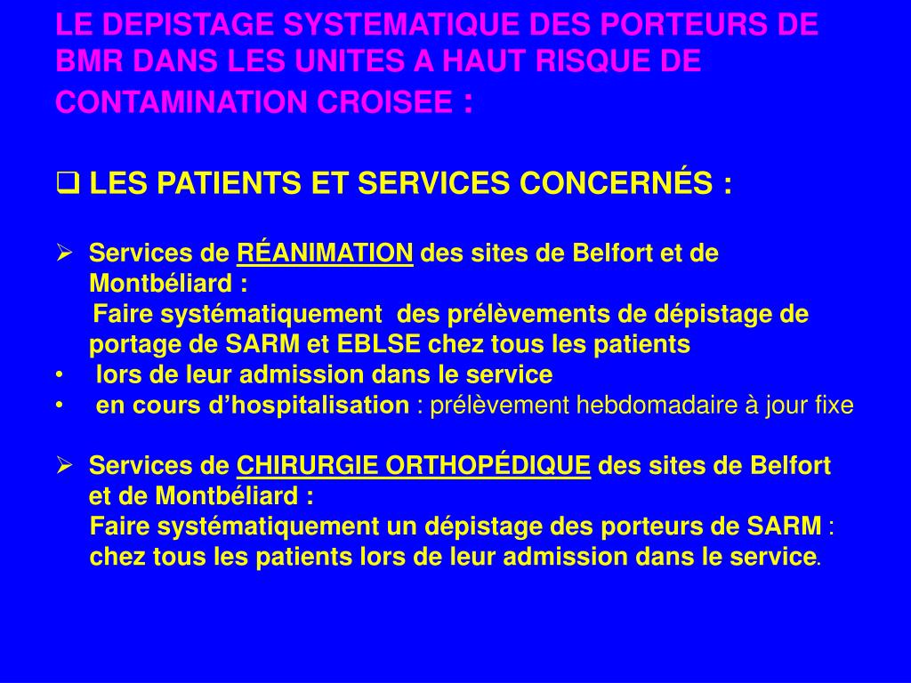 LE DEPISTAGE SYSTEMATIQUE DES PORTEURS DE BMR DANS LES UNITES A HAUT RISQUE DE CONTAMINATION CROISEE : • LES PATIENTS ET SERVICES CONCERNÉS : • Services de RÉANIMATION des sites de Belfort et de Montbéliard : Faire systématiquement des prélèvements de dépistage de portage de SARM et EBLSEchez tous les patients • lors de leur admission dans le service • en cours d’hospitalisation : prélèvement hebdomadaire à jour fixe • Services de CHIRURGIE ORTHOPÉDIQUE des sites de Belfort et de Montbéliard : Faire systématiquement un dépistage des porteurs de SARM : chez tous les patients lors de leur admission dans le service.