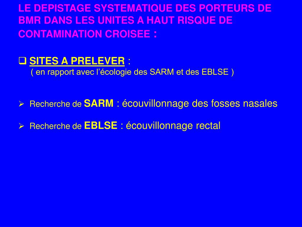 LE DEPISTAGE SYSTEMATIQUE DES PORTEURS DE BMR DANS LES UNITES A HAUT RISQUE DE CONTAMINATION CROISEE : • SITES A PRELEVER : ( en rapport avec l’écologie des SARM et des EBLSE ) • Recherche de SARM : écouvillonnage des fosses nasales • Recherche de EBLSE : écouvillonnage rectal