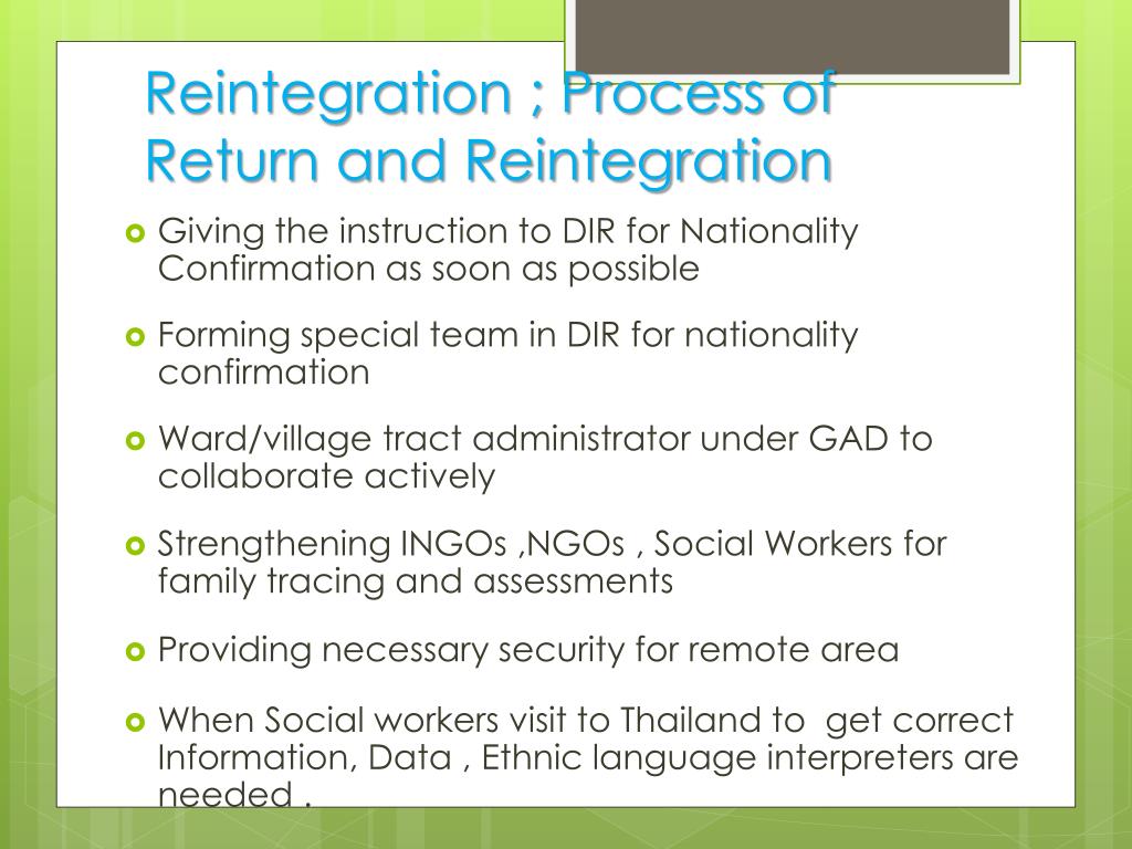 Reintegration ; Process of Return and Reintegration • Giving the instruction to DIR for Nationality Confirmation as soon as possible • Forming special team in DIR for nationality confirmation • Ward/village tract administrator under GAD to collaborate actively • Strengthening INGOs ,NGOs , Social Workers for family tracing and assessments • Providing necessary security for remote area • When Social workers visit to Thailand to get correct Information, Data , Ethnic language interpreters are needed .