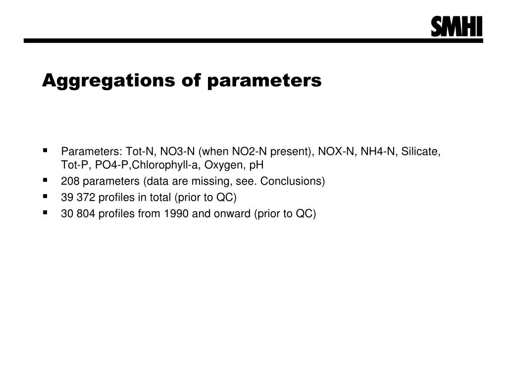 Aggregations of parameters • Parameters: Tot-N, NO3-N (when NO2-N present), NOX-N, NH4-N, Silicate, Tot-P, PO4-P,Chlorophyll-a, Oxygen, pH • 208 parameters (data are missing, see. Conclusions) • 39 372 profiles in total (prior to QC) • 30 804 profiles from 1990 and onward (prior to QC)