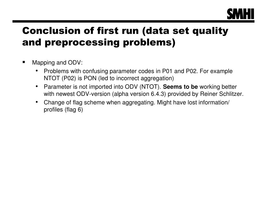 Conclusion of first run (data set quality and preprocessing problems) • Mapping and ODV: • Problems with confusing parameter codes in P01 and P02. For example NTOT (P02) is PON (led to incorrect aggregation) • Parameter is not imported into ODV (NTOT). Seems to be working better with newest ODV-version (alpha version 6.4.3) provided by Reiner Schlitzer. • Change of flag schemewhenaggregating. Might have lost information/ profiles (flag 6)