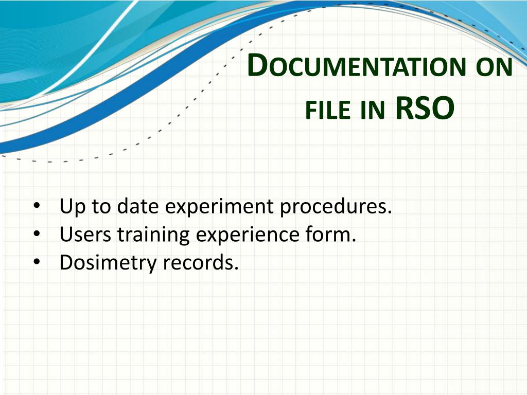 Documentation on file in RSO • Up to date experiment procedures. • Users training experience form. • Dosimetry records.