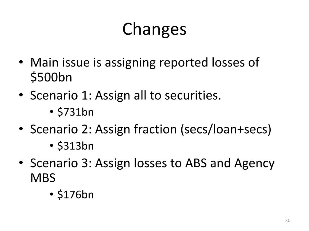 Changes • Main issue is assigning reported losses of $500bn • Scenario 1: Assign all to securities. • $731bn • Scenario 2: Assign fraction (secs/loan+secs) • $313bn • Scenario 3: Assign losses to ABS and Agency MBS • $176bn