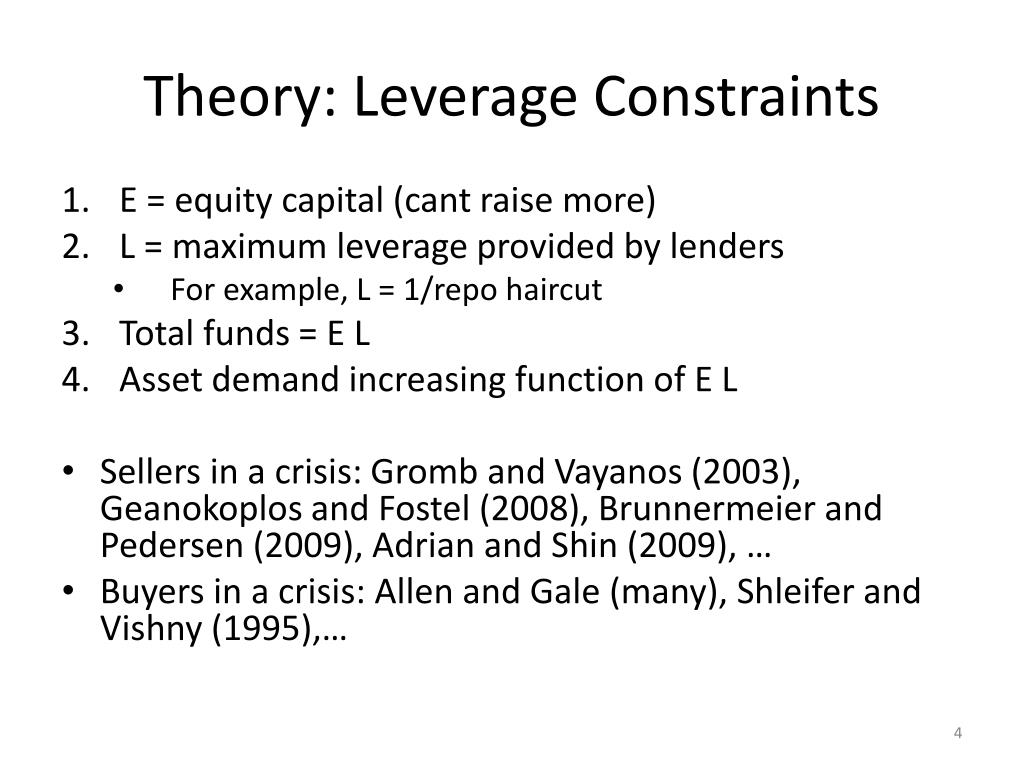 Theory: Leverage Constraints • E = equity capital (cant raise more) • L = maximum leverage provided by lenders • For example, L = 1/repo haircut • Total funds = E L • Asset demand increasing function of E L • Sellers in a crisis: Gromb and Vayanos (2003), Geanokoplos and Fostel (2008), Brunnermeier and Pedersen (2009), Adrian and Shin (2009), … • Buyers in a crisis: Allen and Gale (many), Shleifer and Vishny (1995),…