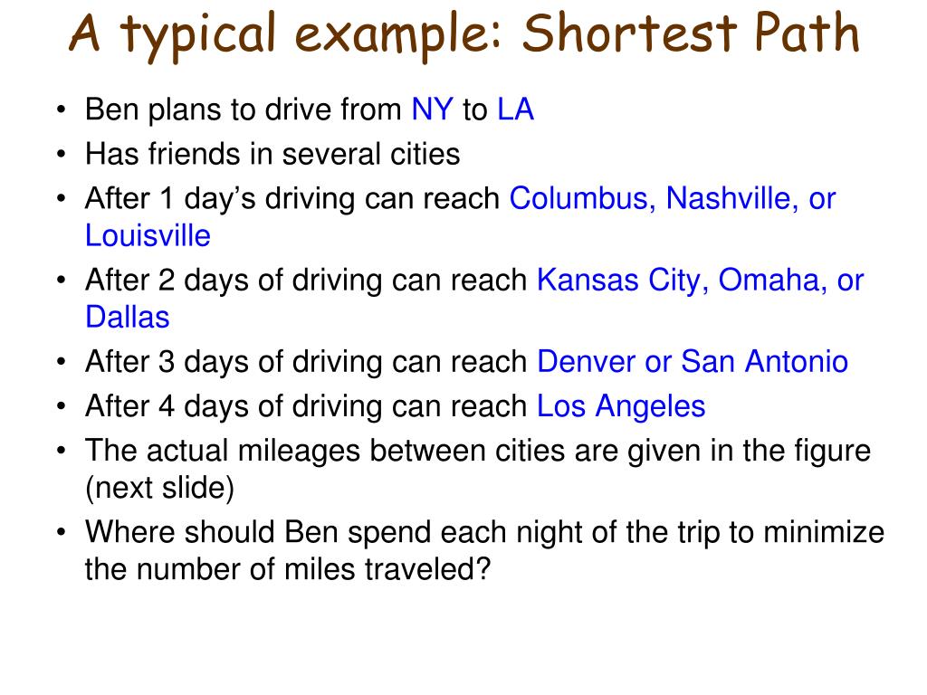 A typical example: Shortest Path • Ben plans to drive from NY to LA • Has friends in several cities • After 1 day’s driving can reach Columbus, Nashville, or Louisville • After 2 days of driving can reach Kansas City, Omaha, or Dallas • After 3 days of driving can reach Denver or San Antonio • After 4 days of driving can reach Los Angeles • The actual mileages between cities are given in the figure (next slide) • Where should Ben spend each night of the trip to minimize the number of miles traveled?