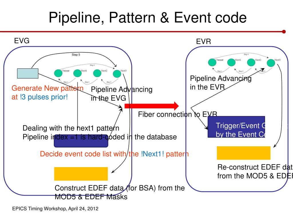 Pipeline, Pattern & Event code EVG EVR Step 5 Pipeline Advancing in the EVR Generate New pattern at !3 pulses prior! Pipeline Advancing in the EVG Fiber connection to EVR Trigger/Event Generation by the Event Code Dealing with the next1 pattern Pipeline index =1 is hard-coded in the database Decide event code list with the !Next1! pattern Re-construct EDEF data (for BSA)from the MOD5 & EDEF Masks Construct EDEF data (for BSA) from theMOD5 & EDEF Masks